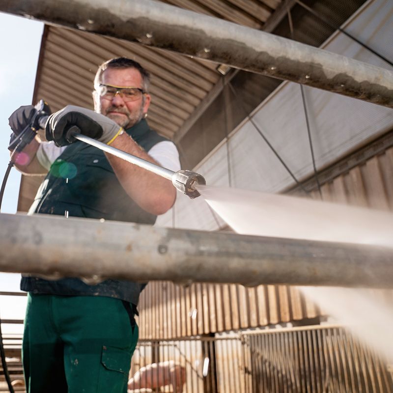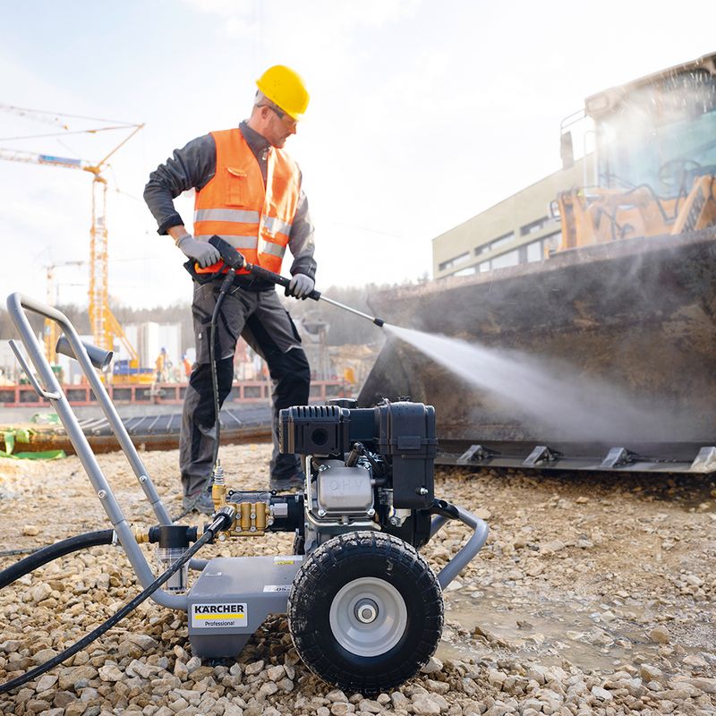 La compacta HD 6/15 G Classic es el equipo básico ideal para introducirse en el mundo de las limpiadoras de alta presión de agua fría móviles y a gasolina de Kärcher. Extremadamente fácil de transportar en un automóvil, gracias a sus 150 bar de presión de trabajo, su robusta bomba de cigüeñal y su caudal de agua de hasta 600 litros por hora consigue dominar incluso las tareas de limpieza más exigentes, como pueden ser en las obras o en el ámbito de los servicios municipales. El motor de gasolina integrado (EU STAGE V) proporciona independencia de las fuentes de corriente externas, las ruedas con cámara de aire garantizan la movilidad necesaria en el lugar de uso, y el asa de empuje ergonómica y el práctico almacenamiento de accesorios permiten un manejo sencillo para el usuario. Además, es posible acceder fácilmente a los componentes protegidos mediante termoválvula y válvula de seguridad. Asimismo, el estable bastidor tubular de acero de la HD 6/15 G Classic evita eficazmente los daños debidos a efectos mecánicos del exterior.